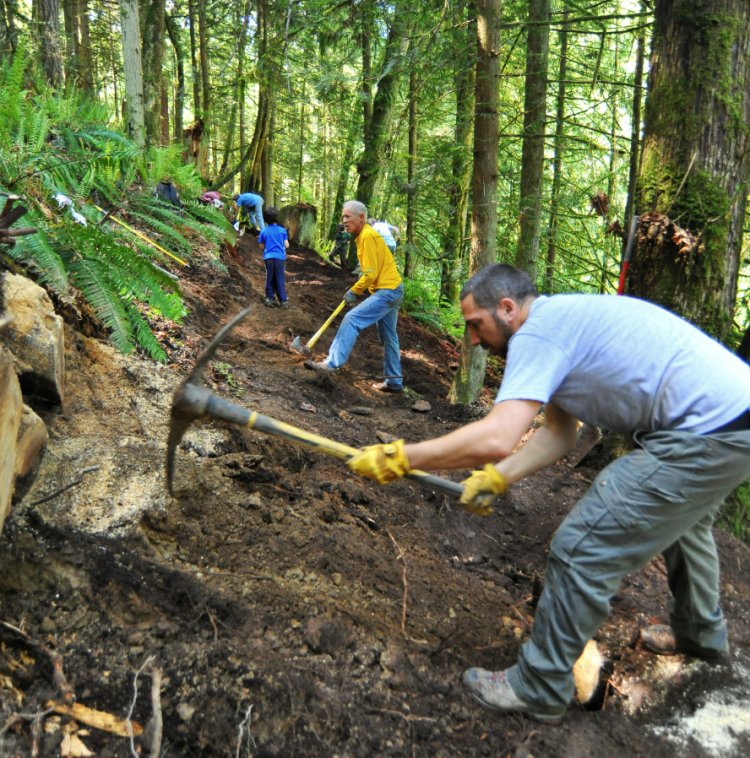 We had 6 workers on Friday and 15 on Saturday. This was an excellent turnout for a holiday weekend. The lead crew removing the duff is at the point where the trail turns east. At that point, we are 175′ from the bridge site. The trail is completed about 75′ back from that point. So we have about 250′ left to complete. So, it looks like we are in good shape to start on the bridge on June 15. At that work session we will be splitting up the crew, some will continuing working on the trail and a few will work on the footings for the bridge.