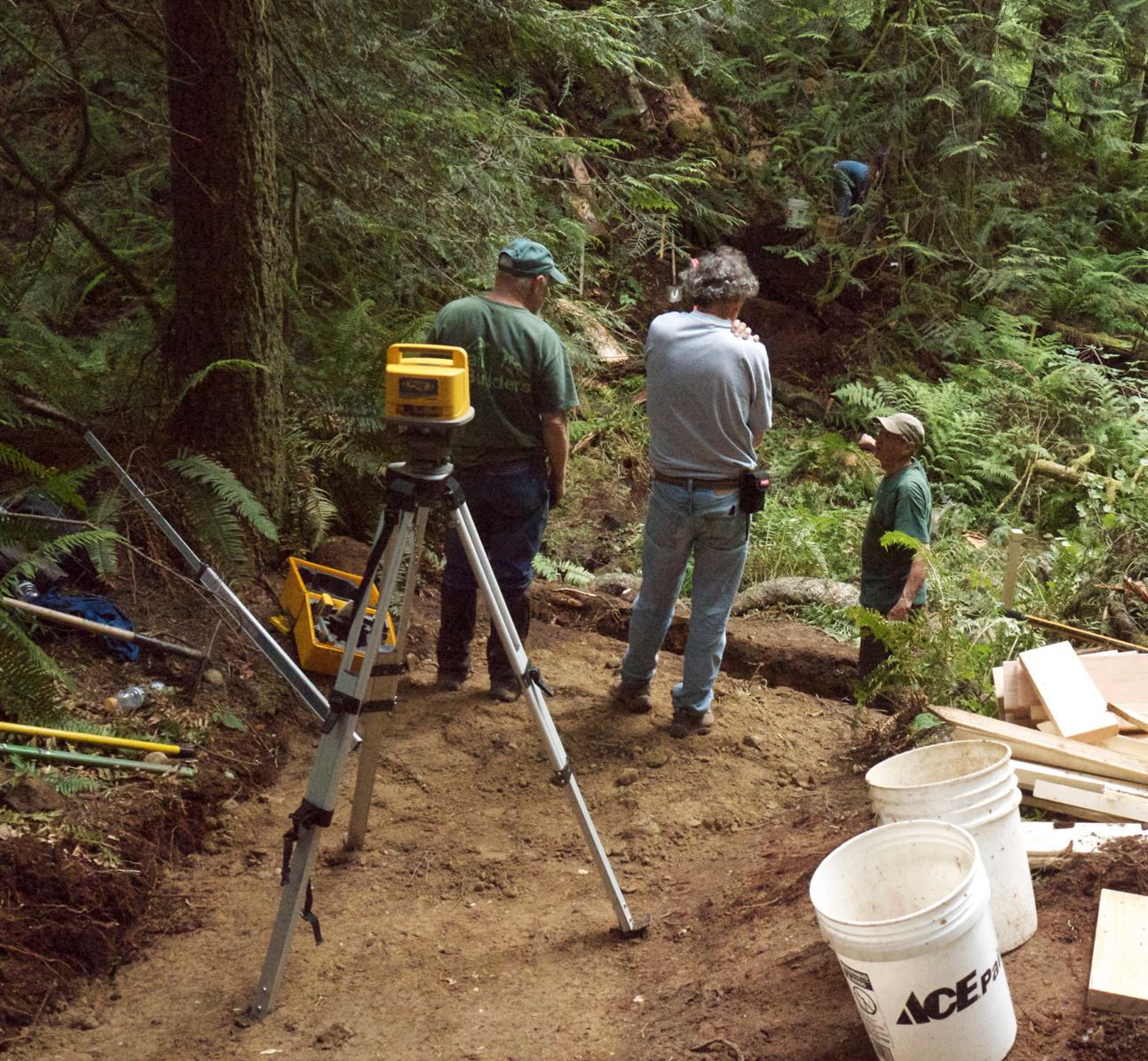 We’ve reached the bridge site and work has begun on digging the footings for the bridge. Here Art, Jerry, and John discuss construction.