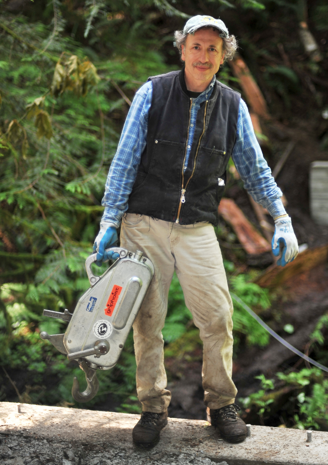 Once it was positioned between the bridge footings the glulam was set down and picked up at one point at its middle. This allowed it to be turned so that each end sat at the proper location on the footings.