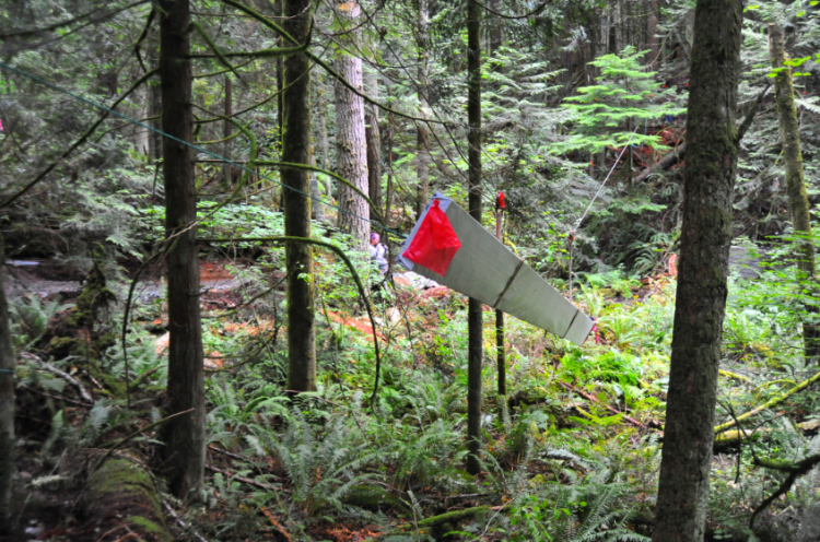 Both ends of the glulam were hooked up to the highline and it was allowed to slowly slide down the line on pulleys.