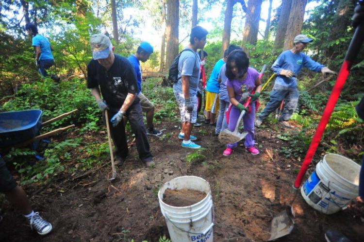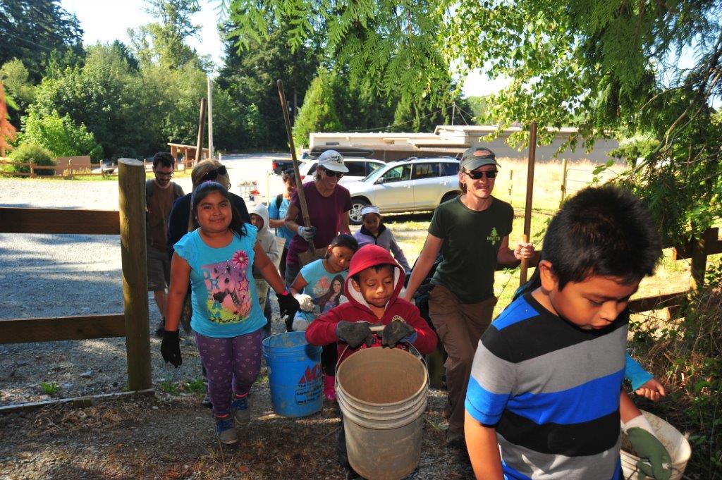Last session we had the Kulshan Kids lending a hand. They helped us on a future project, a new connector that will link neighborhoods on the south side of Little Mountain. Here you see them arrive, with some of the group’s leadership carrying healthy snacks.