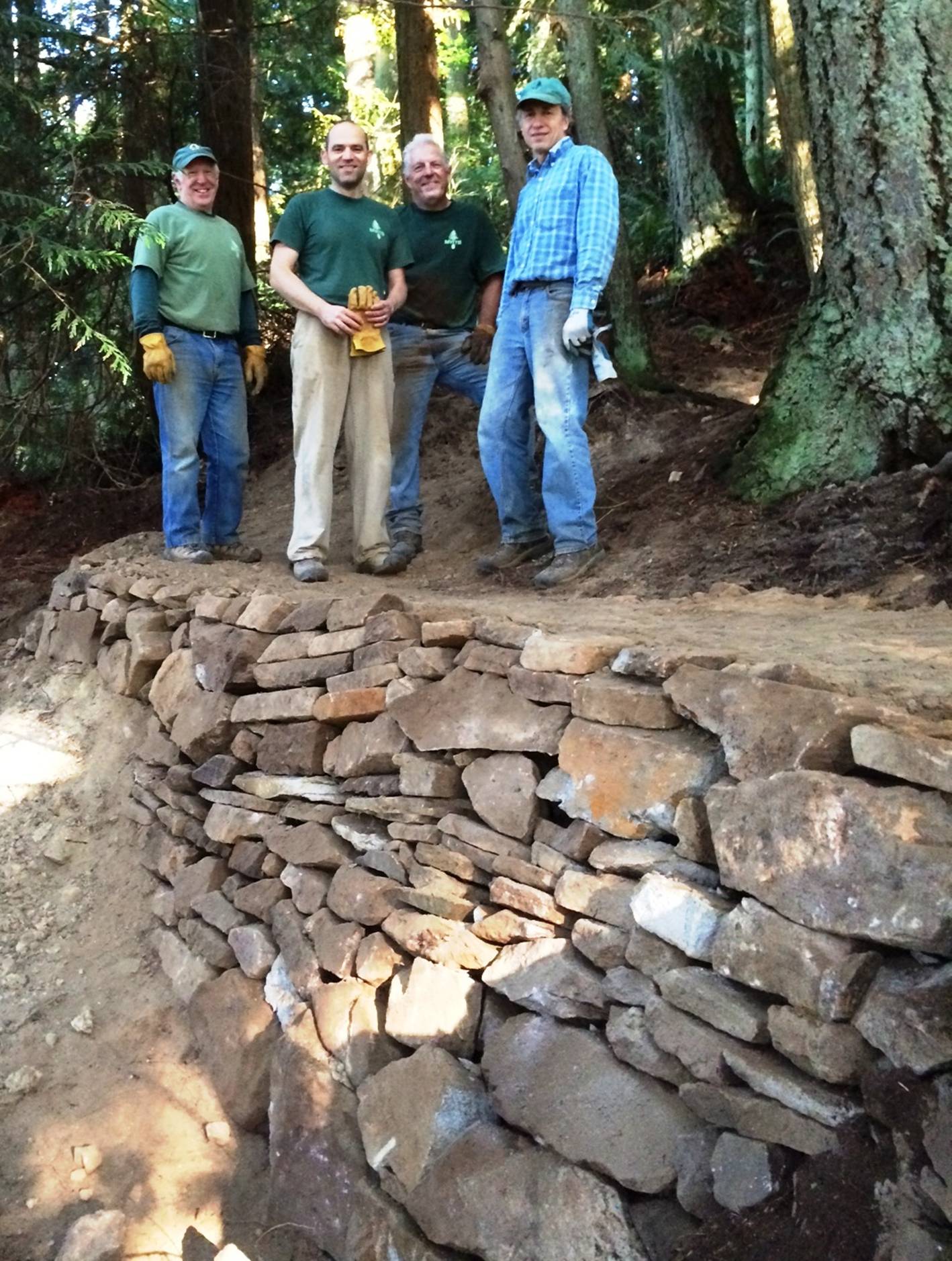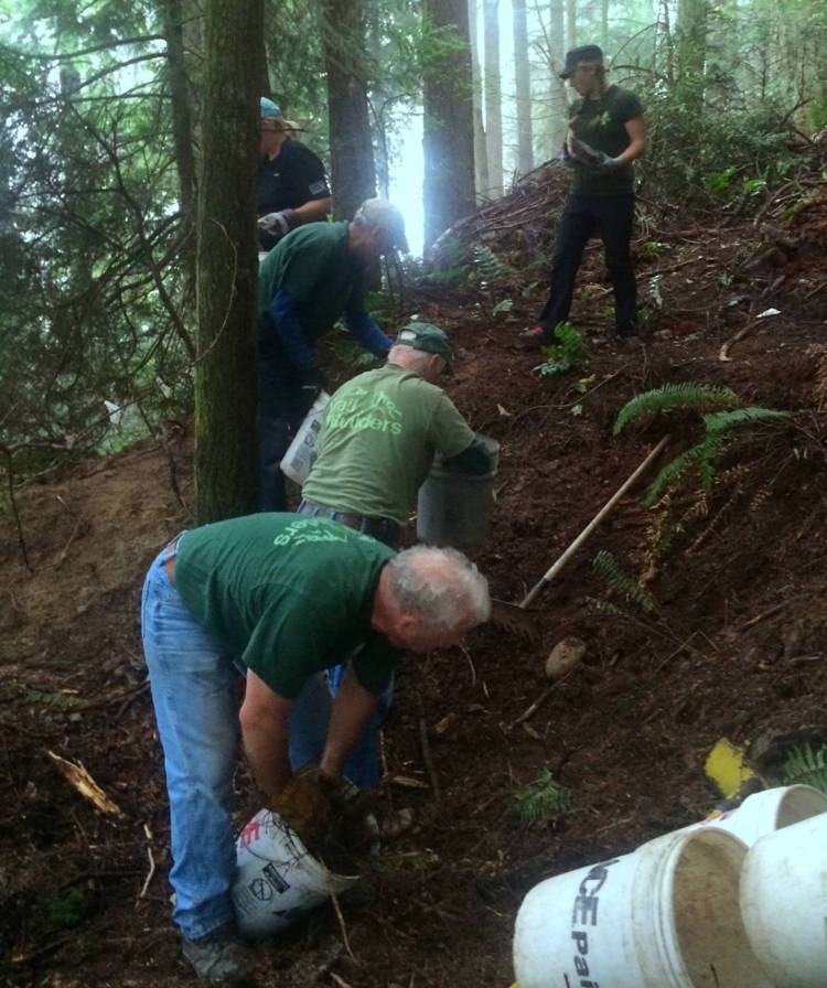 Below you will see our volunteers clearing the extended routing of debris; deadfall, branches and duff. Having the opportunity to extend this corner was made possible by a cooperative effort. Our friend Hal Lee borrowed a GPS unit from the Skagit Land Trust (SLT) to help us determine the property line. This made it possible for the Mount Vernon Parks Department to approve the extended routing, which makes for a much better corner. The slop can be more gradual, making it safer and more sustainable. A special thanks to all involved.