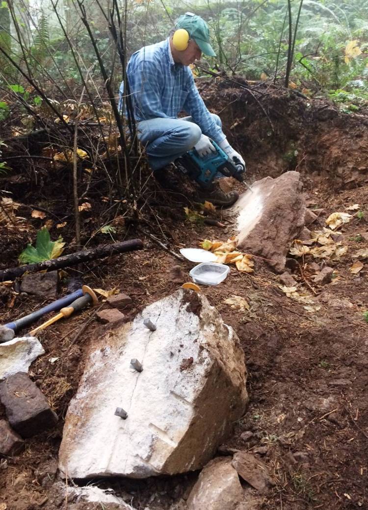 And while the extended routing was being prepared native material was being prepared by Art Tuftee. As you can see, a battery operated roto-hammer is a wonderful tool. And look at the split rock in the foreground, ready to be moved down to the wall – but how you may ask…