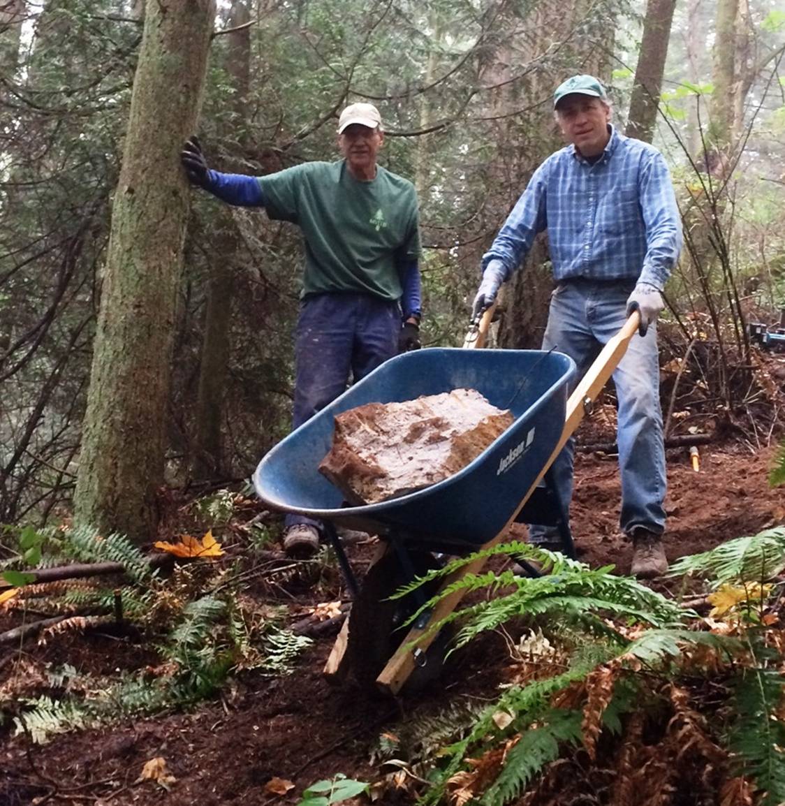 While there are many methods for moving large rocks, below you’ll see one of our favorites. Here Art carefully moves one of the rock halves down the hill and John Erbstoeszer looks on. Art is using one of our braking wheelbarrows that we find to be indispensable where motorized equipment can’t be utilized. We built these wheelbarrows that have modified bicycle disc brakes on them.
