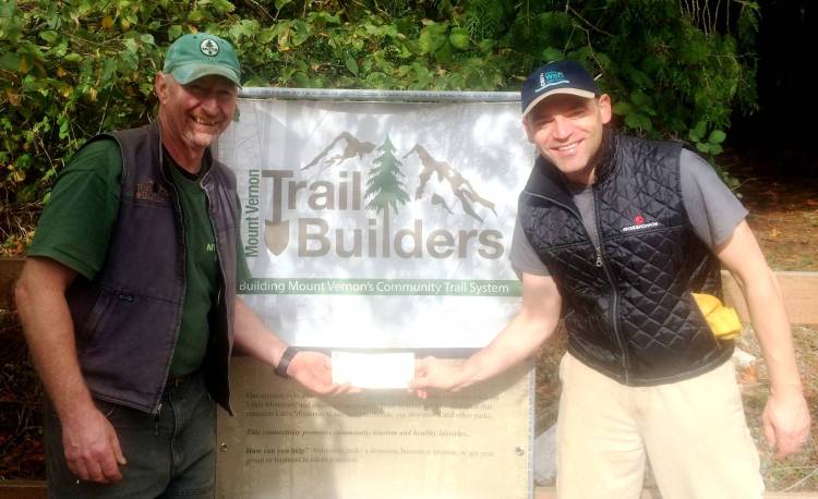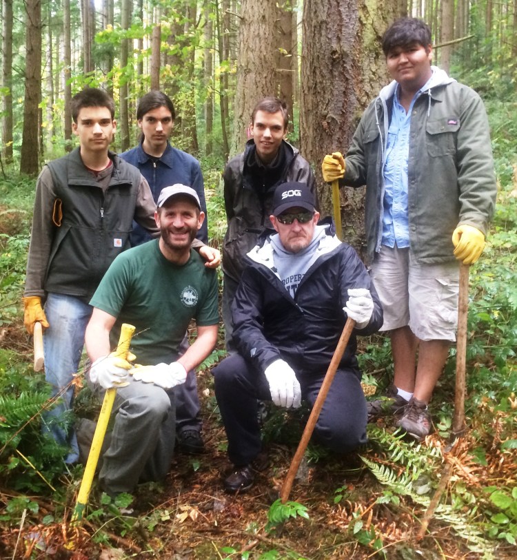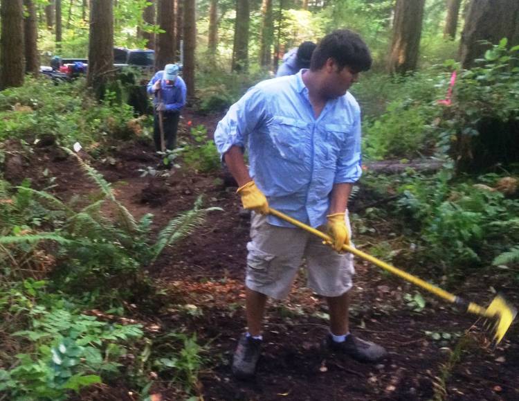Below you’ll see the new connector trail we worked on. It is located above the Silver Arrow Bowmen Archery Range. While it is punched through, it is yet to be completed. Here Jerry’s working in the background, with a Skagit Valley College Outdoor Club member up front.