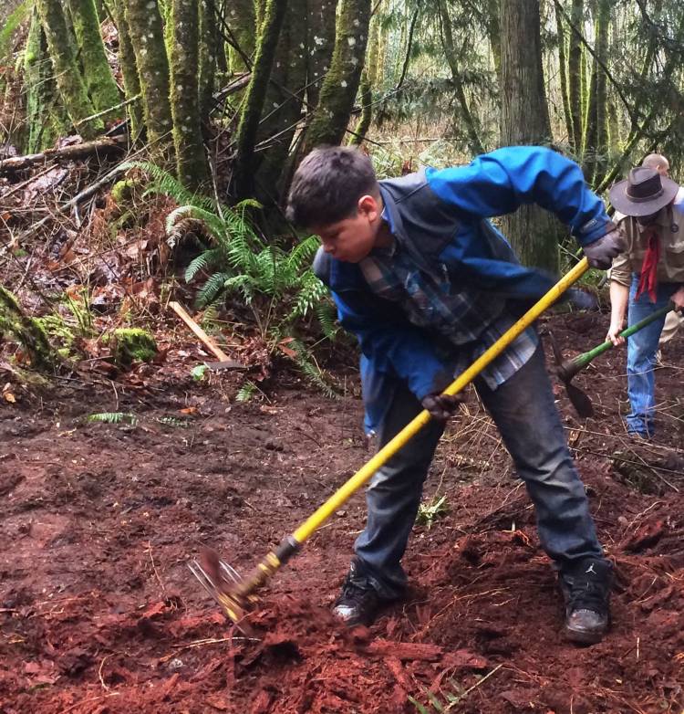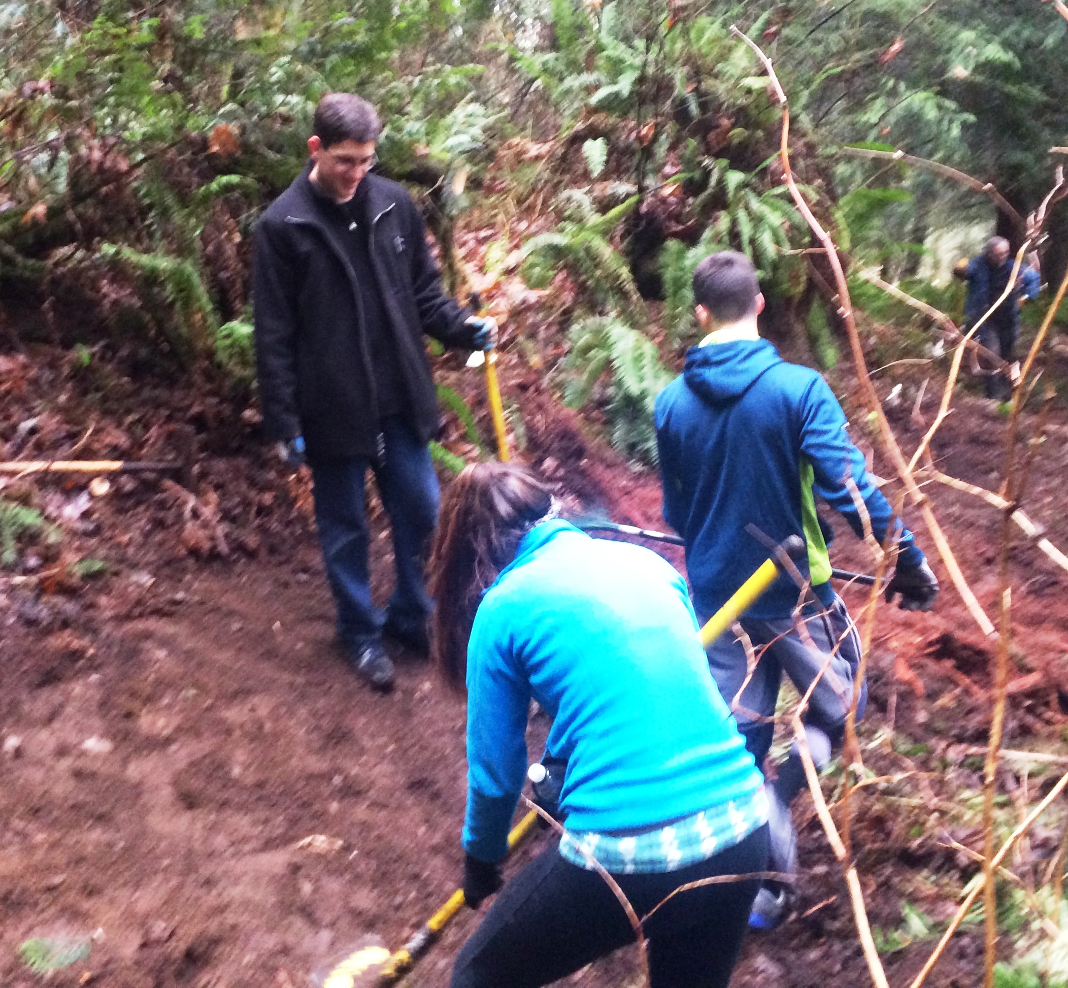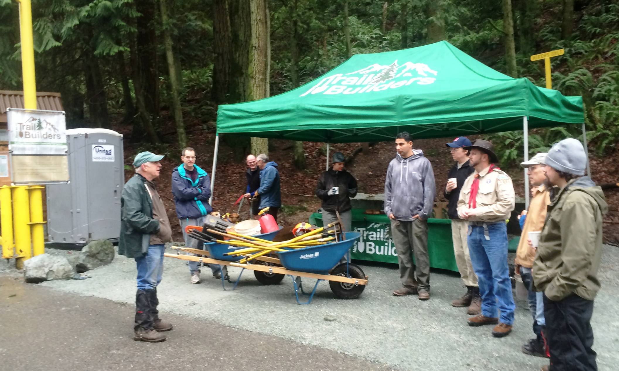 In the photo he is digging the organic material (rotten wood) out of what will soon be a hardened trail tread. Maybe he’ll be giving the safety talk one day…