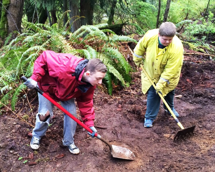 Below Stryker and Jesse show us the advantages of working on a wet day. An accumulation of mud shows us where a new trail routing needs to be built up with rock. Here they are removing the mud before placing fabric and rock.