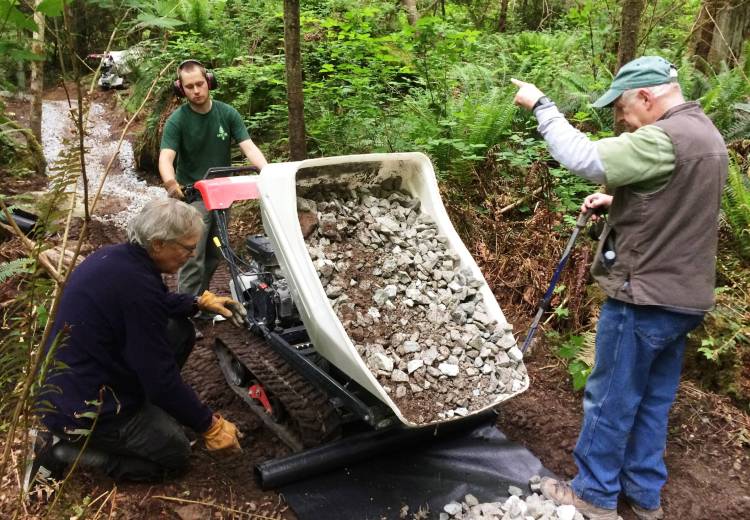 While long weekend sessions can sometimes result in light turnouts, we had twenty (20) volunteers and perfect weather. Since it was another session that we were all working really hard not many photos were taken. Below you’ll see Simon LeClair, our newest equipment operator, dumping a load of railroad ballast. Jerry directs the dumping as Lyall rolls out the Geo-tech material.