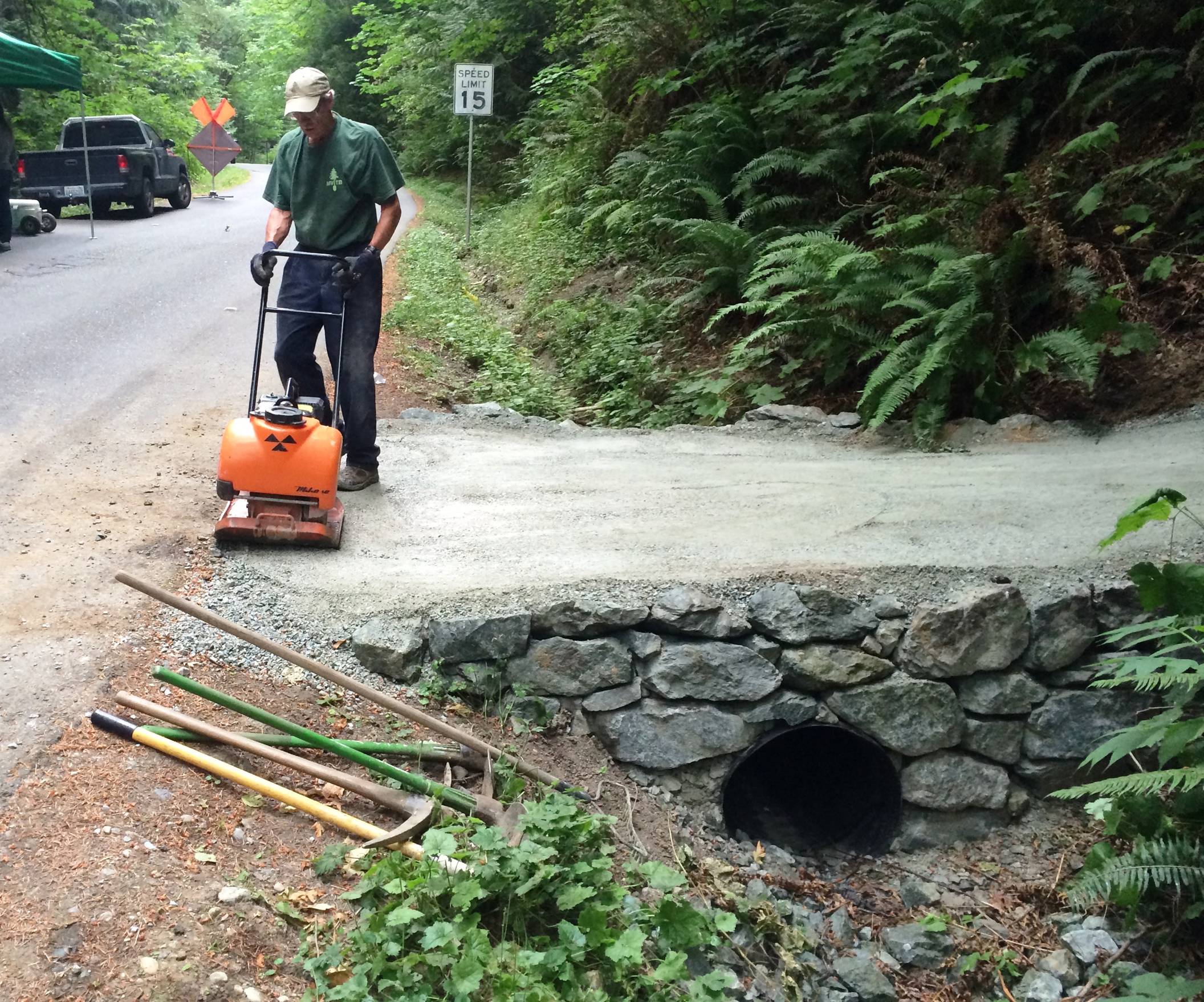 The July 11th session was a hot one. Our eleven (11) volunteers worked on the road crossing. In the following image John is compacting the final tread.