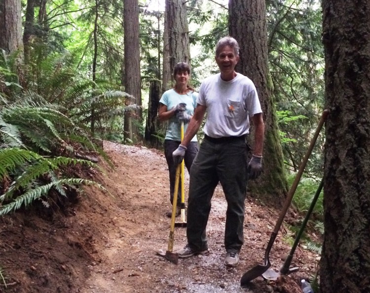 In this second image (below) Kinsey and Maria widen the trail just above the crossing. The material they removed was moved down to the crossing.