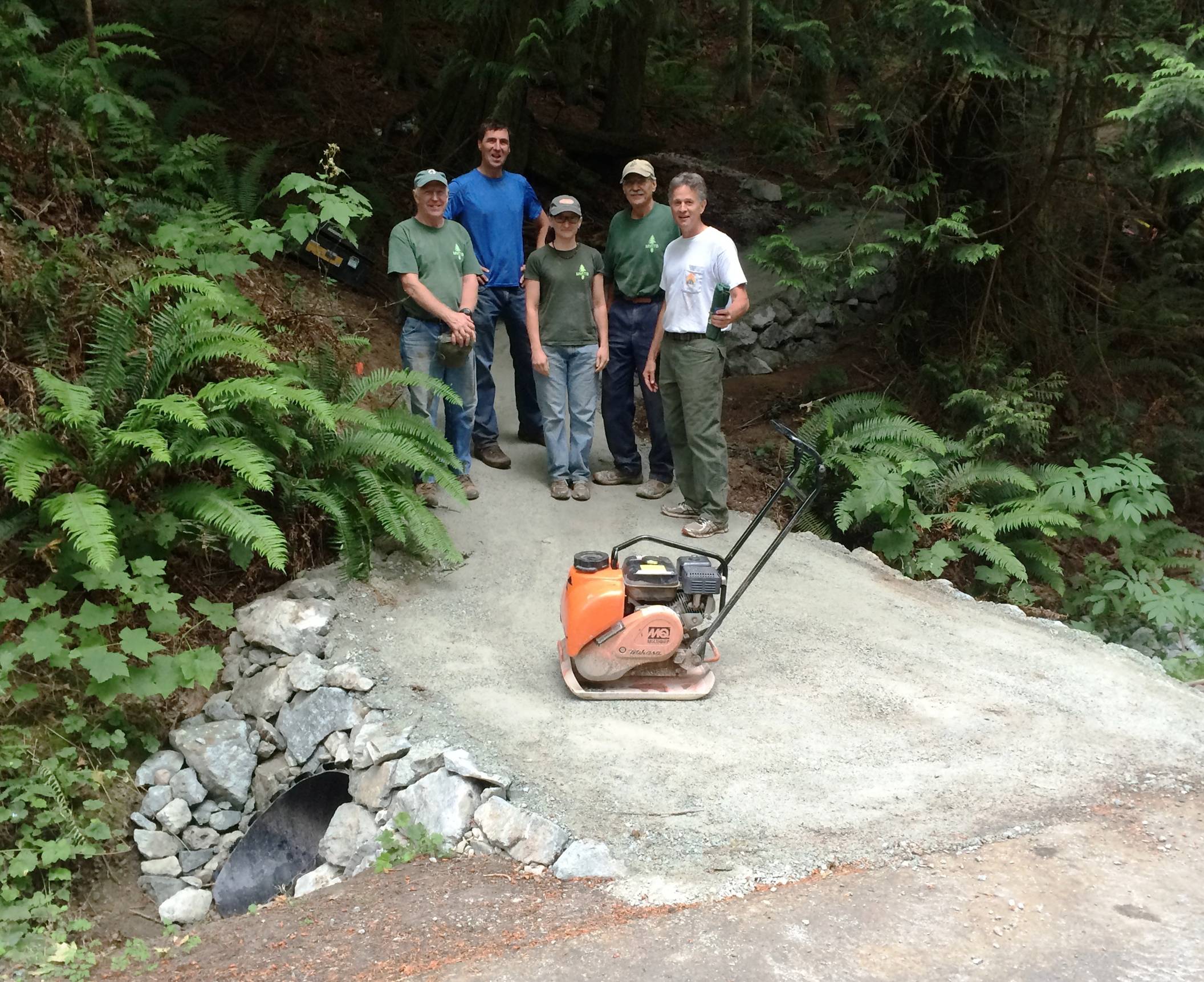 And in this last photo you’ll see the finished crossing, along with a handful of the volunteers that helped wrap it up. Other work (not shown) was wall building behind the parking area at the Park’s main gate and map kiosk.