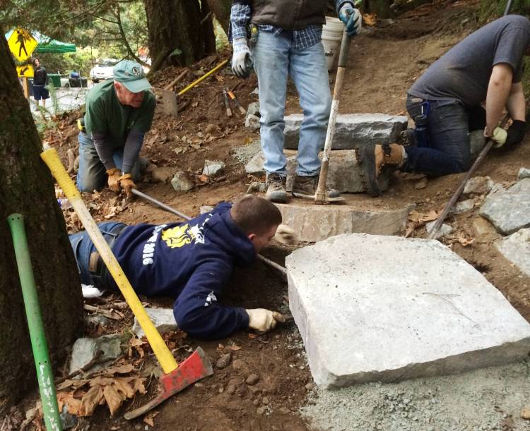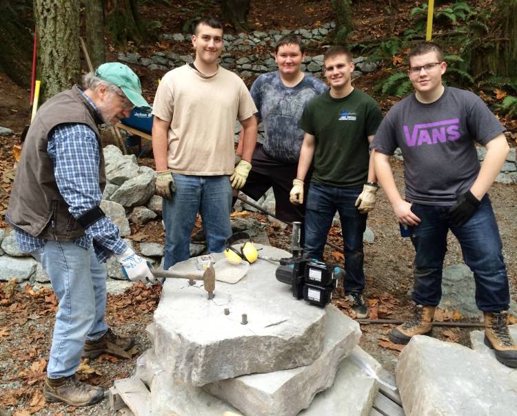 Following, in this fourth photo, another team (at the opposite end of the same trail) was installing stone steps. Art Tuftee shows four new volunteers how to perfectly shape a stone step. After drilling four holes Art taps in special wedges, as you can see it easily breaks off the corner – look closely to see the crack.