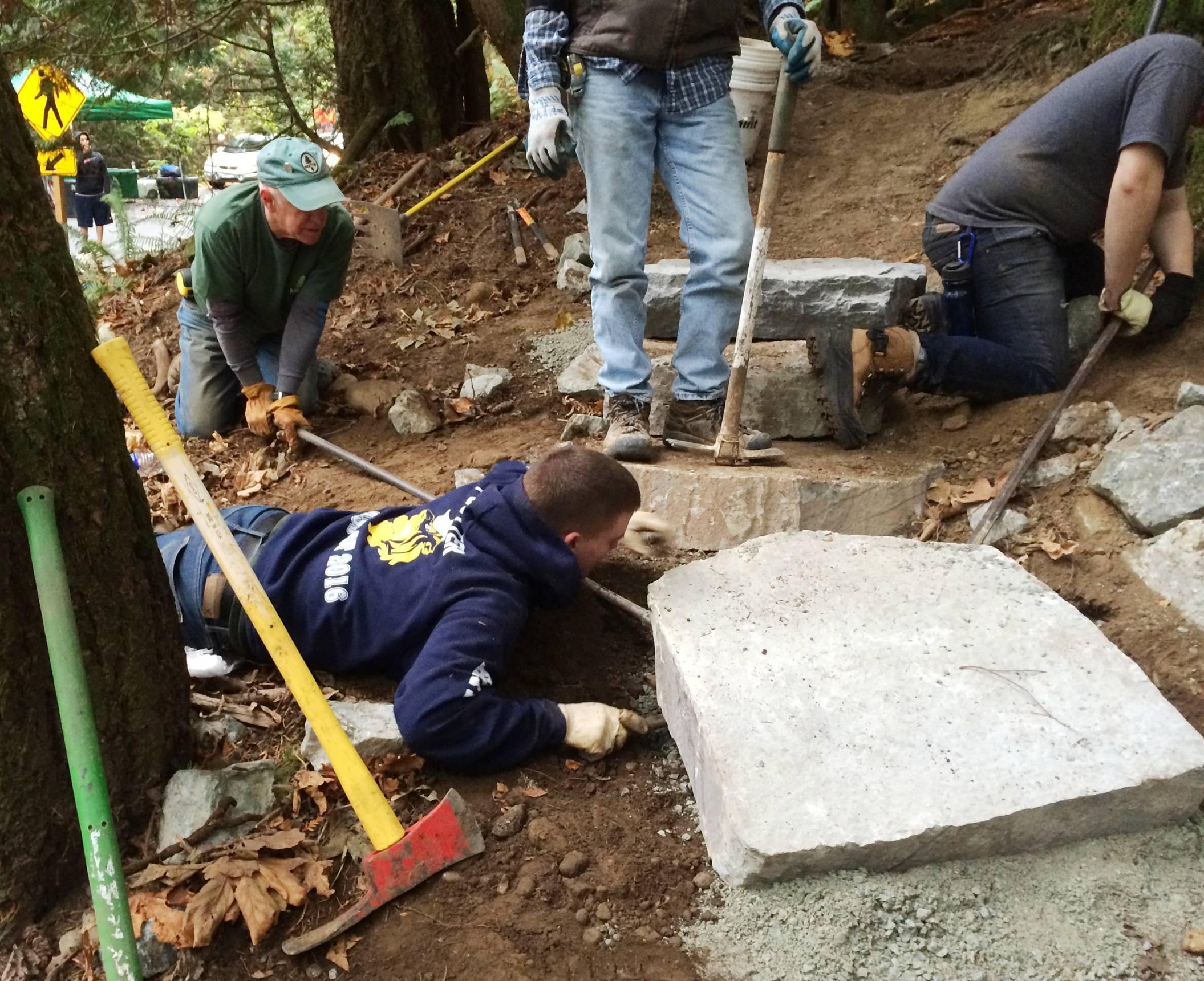 Here (below) after lunch we’re back at work on the steps. Nobody said that installing and leveling stone steps would be easy. Everybody else went back up top to work on Rooty.