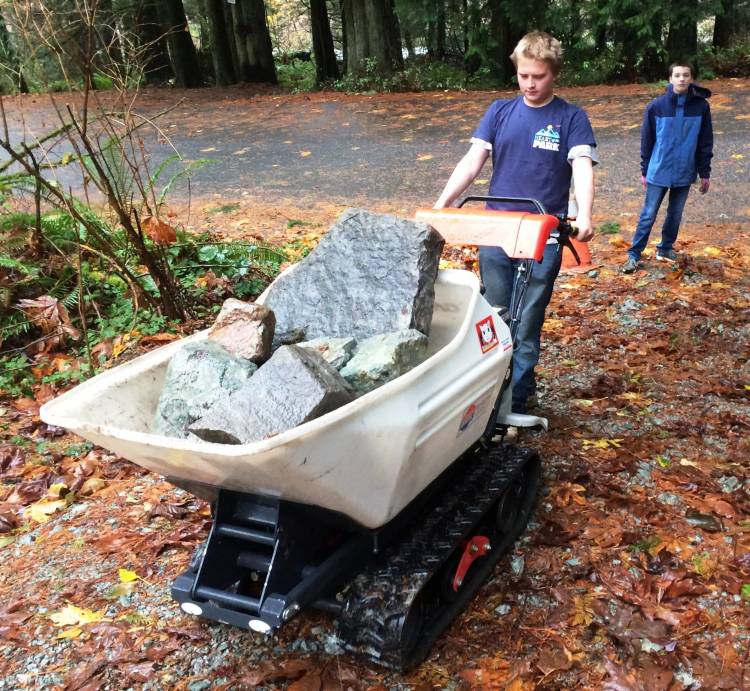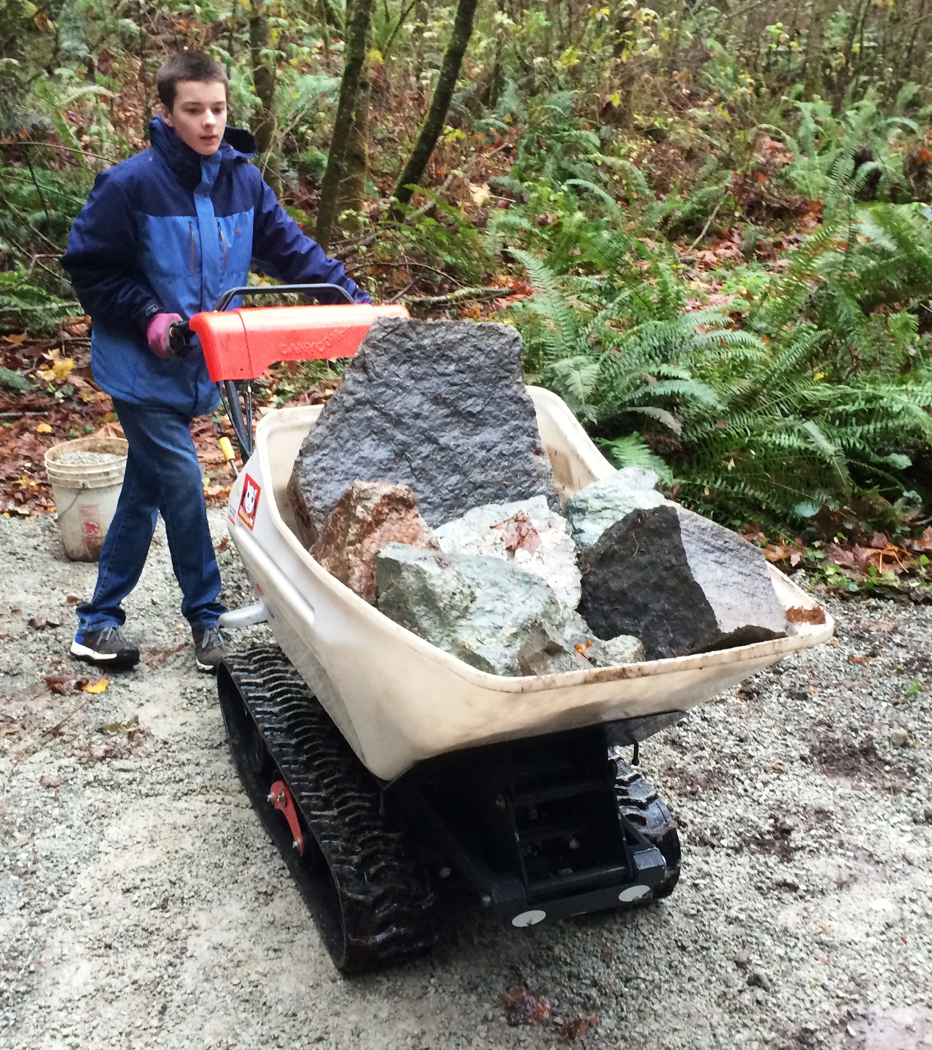 Below Alex gets to develop some new skills, driving the power wheelbarrow.
