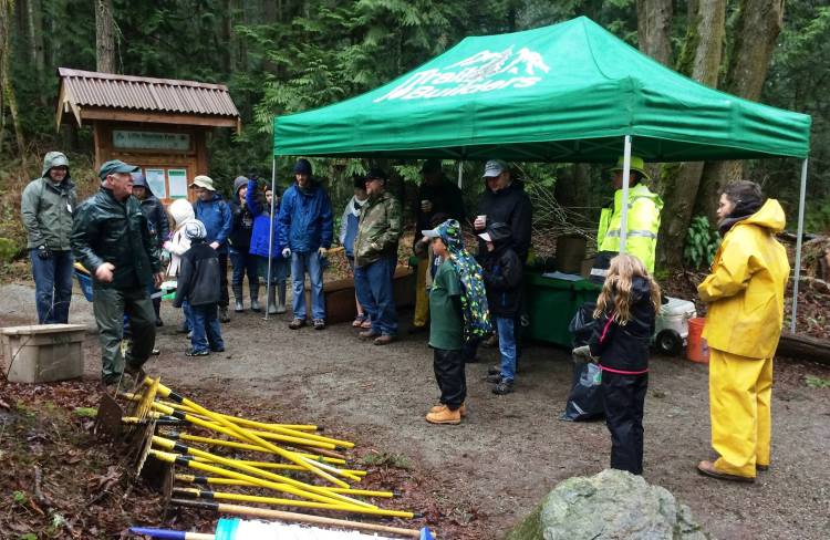 Here (above) we’re at our safety meeting. A couple families joined us for their first time, which helped to double our turnout. Weather was tough again, which slows progress. But with twenty-four (24) volunteers we got a great deal done.