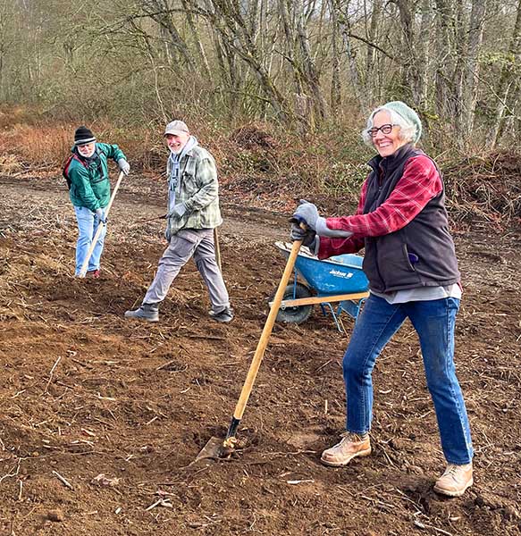 We had 21 cheerful volunteers at our Feb 11 work party, digging blackberry crowns, spreading gravel, and building rock retaining walls.