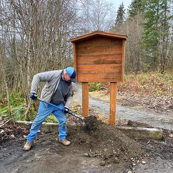 Since our last work party on Jan 28 progress has been made behind the scenes! Skagit County Parks and Recreation installed the trail head kiosk and our equipment had been repaired! JT, Jerry, and Art have been hard at work prepping the trail site for our volunteer work party on Feb 11.