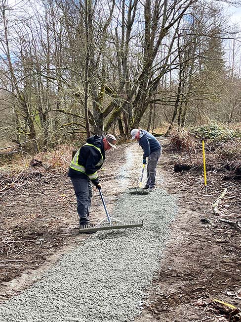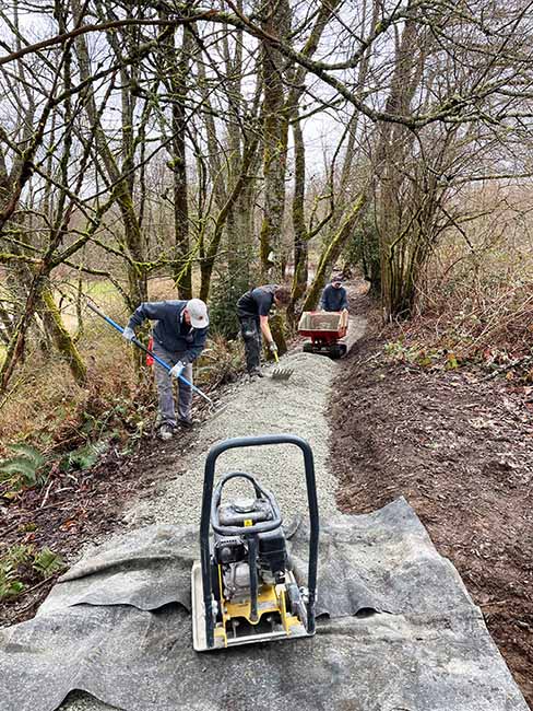 The second set of photos shows the gravel team at work. Our power carrier drivers walk many miles each work party delivering gravel. Once it is poured, two people rake it out to about 3 feet wide and 2 inches thick, creating an even edge and smooth top. Then the gravel gets compacted to create a solid surface for walkers and cyclists.