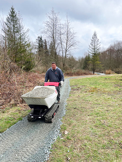 Our mission is to design and build sustainable community trails – this requires reliable equipment that can move lots and lots (and by that we mean tons!!) of rock and gravel over miles of muddy terrain.