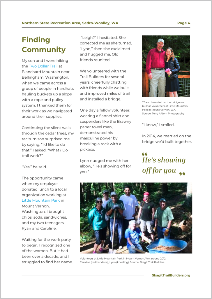 Trail Story: A Path from the Past to the Future Posted bySkagit Trail BuildersMarch 5, 2024November 16, 2025Posted inAdvocacy, Hill Creek Trail, Photos, Uncategorized A PATH FROM THE PAST TO THE FUTURE Sign up for Volunteer Work Parties Instagram Facebook Like Loading... Related Published by Skagit Trail Builders Skagit Trail Builders is 100% volunteer run. Our mission is to design, build, and advocate for multi-use community trails in Skagit County Parks View more posts