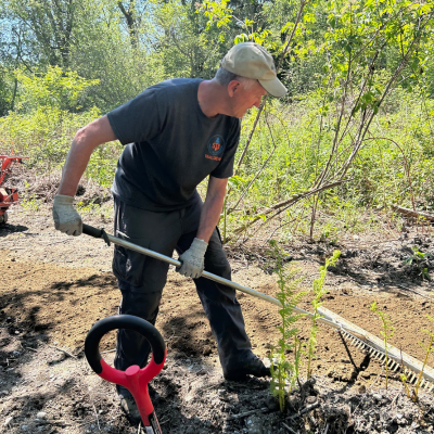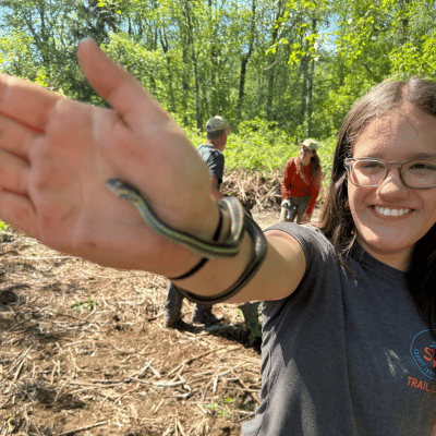 We had a fun work party on May 11. Our volunteers mixed some play into their work catching garden snakes, playing with a visiting dog and some pack goats (sorry we didn’t get a good picture of that – maybe someone can send us their photo?)