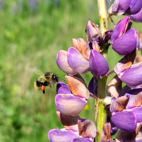 A wild bee collects pollen from the purple Lupine blooming along Hill Creek Trail. Volunteers cleared invasive blackberries and planted wild flower seed in 2022.