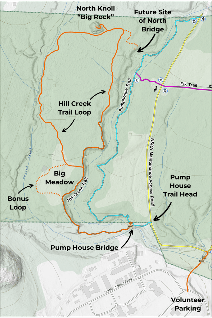 During summer break, Art (contractor with the parks department) and a select group of volunteers will be building North Bridge, connecting Hill Creek Trail to the Pump House Trail at the north end of the park.