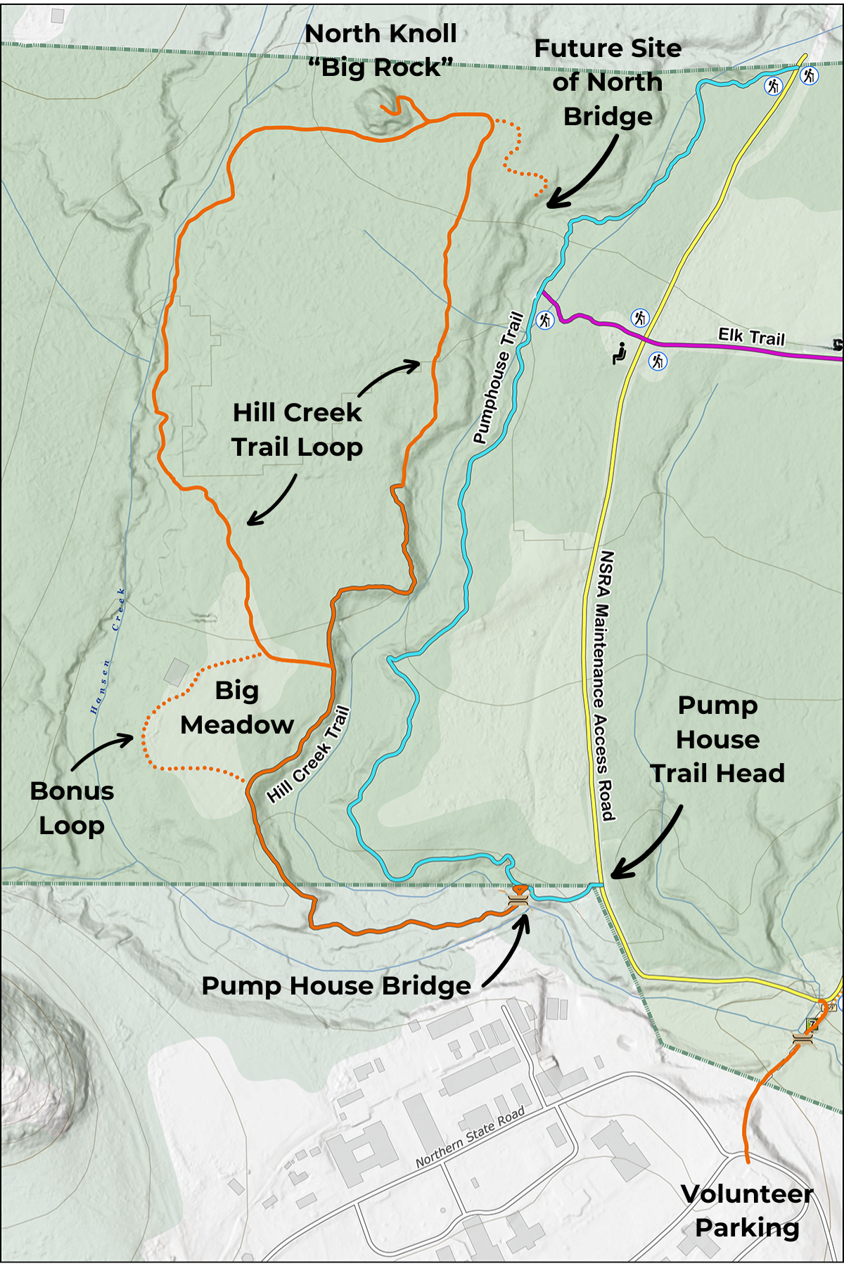 During summer break, Art (contractor with the parks department) and a select group of volunteers will be building North Bridge, connecting Hill Creek Trail to the Pump House Trail at the north end of the park.