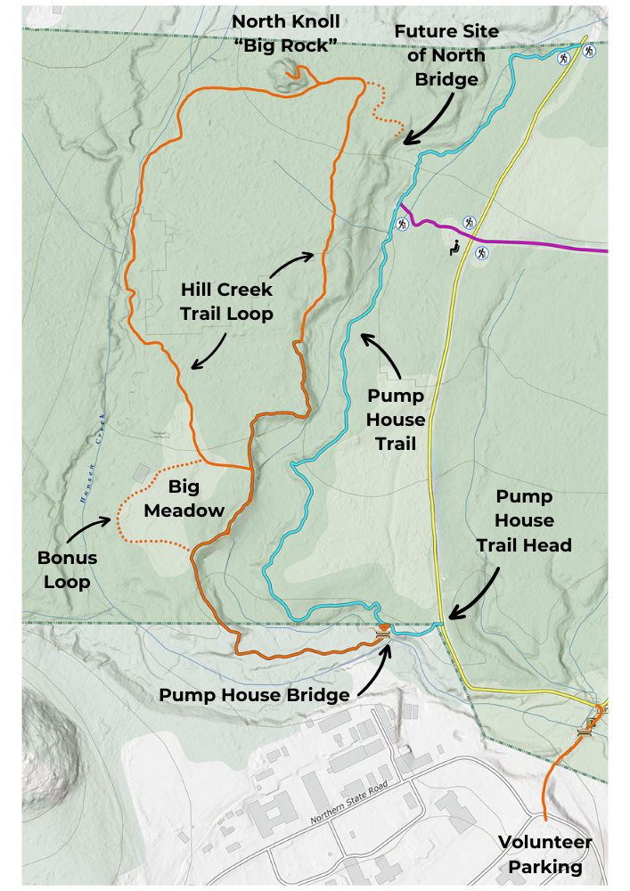 The soil we excavate from the borrow pit will be used on the North Bridge connector trail. We will also have teams working on trail side restoration.