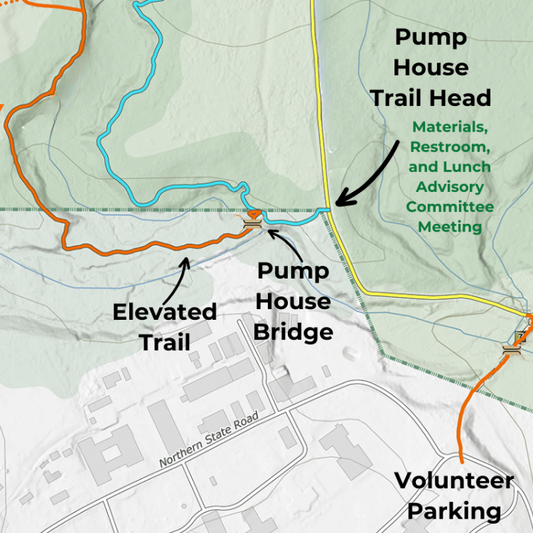 The restoration crew cleared briars by the Pump House Bridge, revealing a historic rock wall built in the early 1900’s. Along the elevated trail in the lower meadow (some people call it “the dike walk”) they cleared briars to open a view of Hansen Creek.