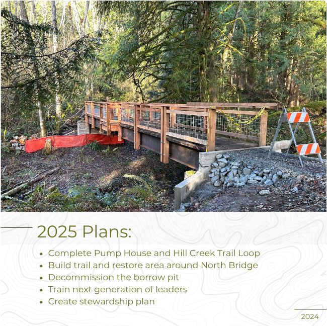 *Note: The county’s contractor will complete North Bridge in early 2025 with the assistance of a small group of volunteers. Once the bridge is complete, we will extend the connector trail, build the elevated approaches, and restore the area around the bridge and creek.