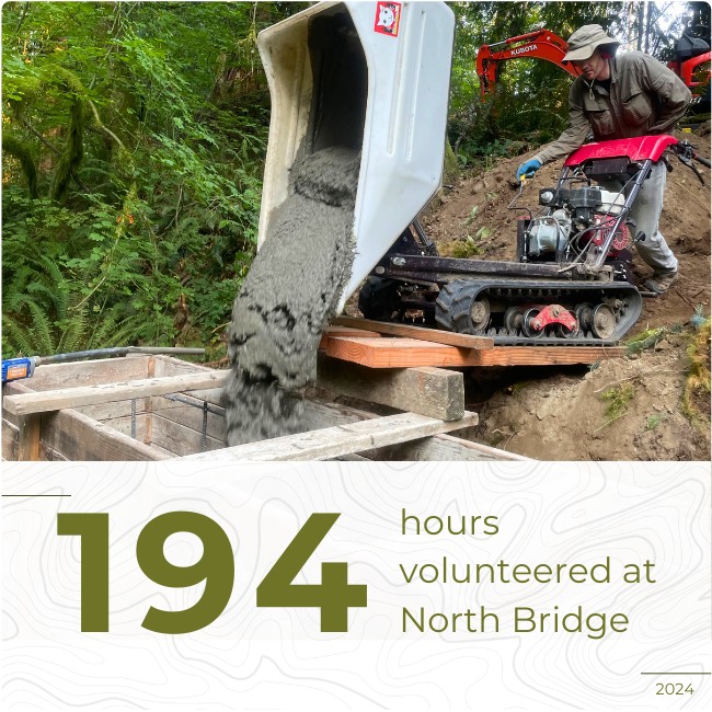 Community volunteers assisted the County’s contractor in building North Bridge. Seven people gave 194 hours to the project.