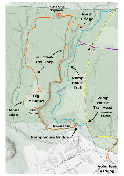 9 am: Walk as a group to the Pump House Trail Head. There we will lead introductions, the safety meeting, explain the day’s work, and assign teams (scroll down to view teams). We’ll also pass out t-shirts to new volunteers and take a group photo.