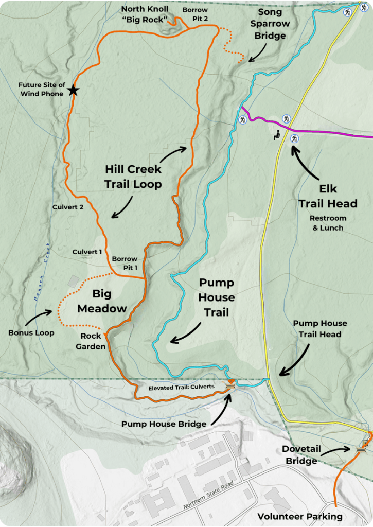 Trail crews commonly use borrow pits to mine mineral soil for constructing a sustainable trail surface that is hard-packed and sheds water. This practice saves money and energy by reducing the amount of material that needs to be brought in from other sources. It also creates a trail surface that is safe for walking, running, and biking, requiring very little maintenance!
