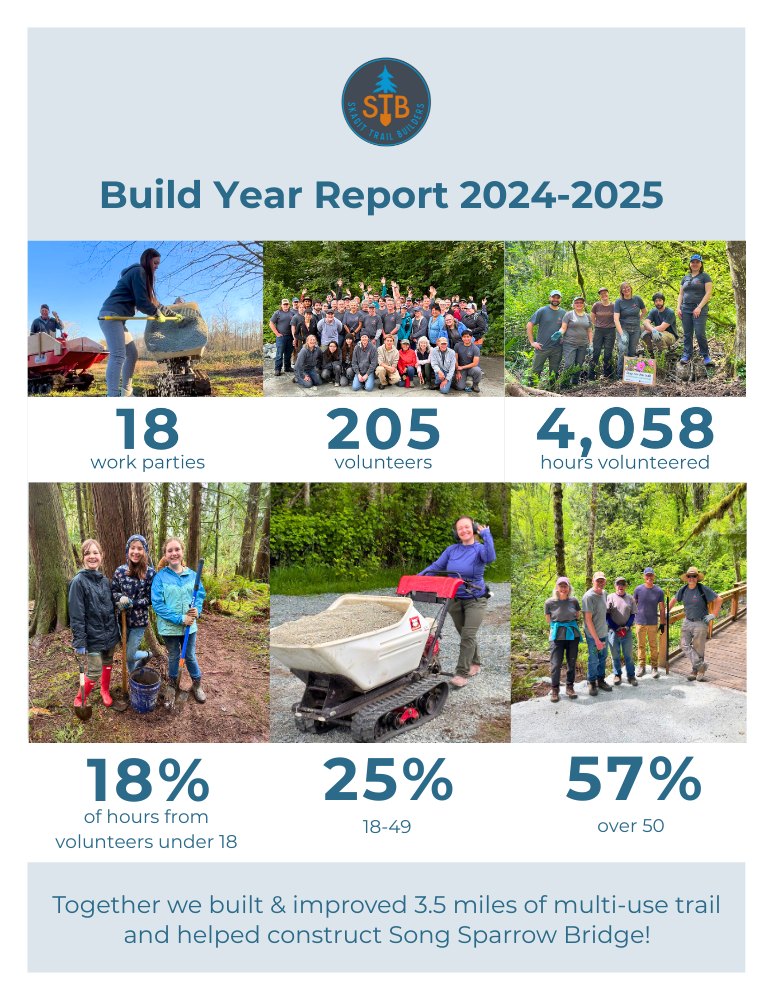 Together, we built and improved 3.5 miles of multi-use trail. Nearly 200 hours was donated to the construction of Song Sparrow Bridge.