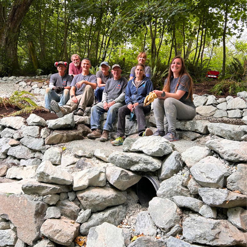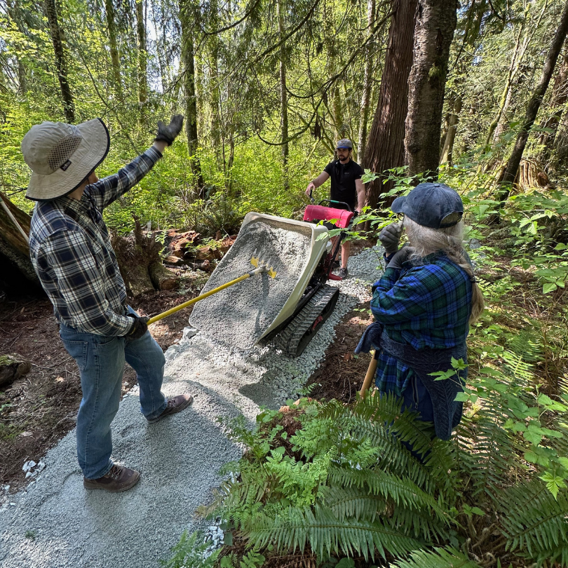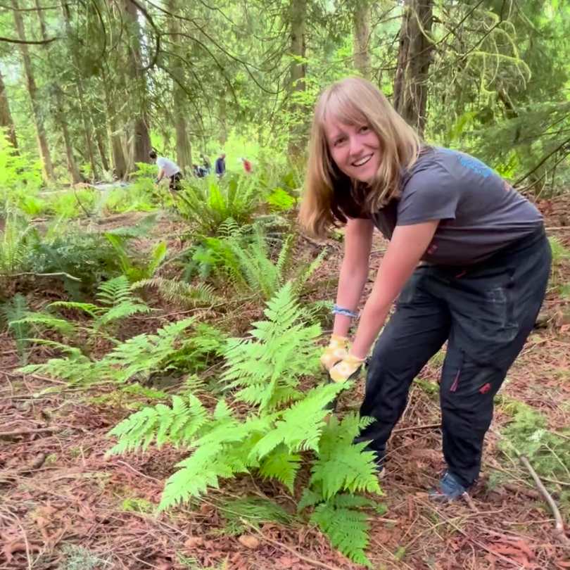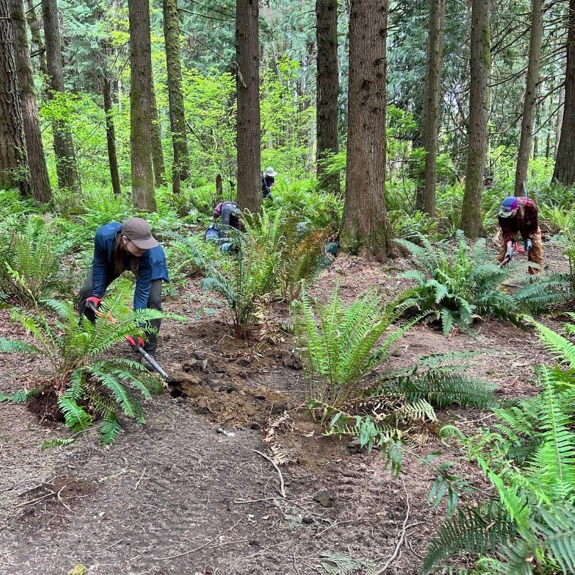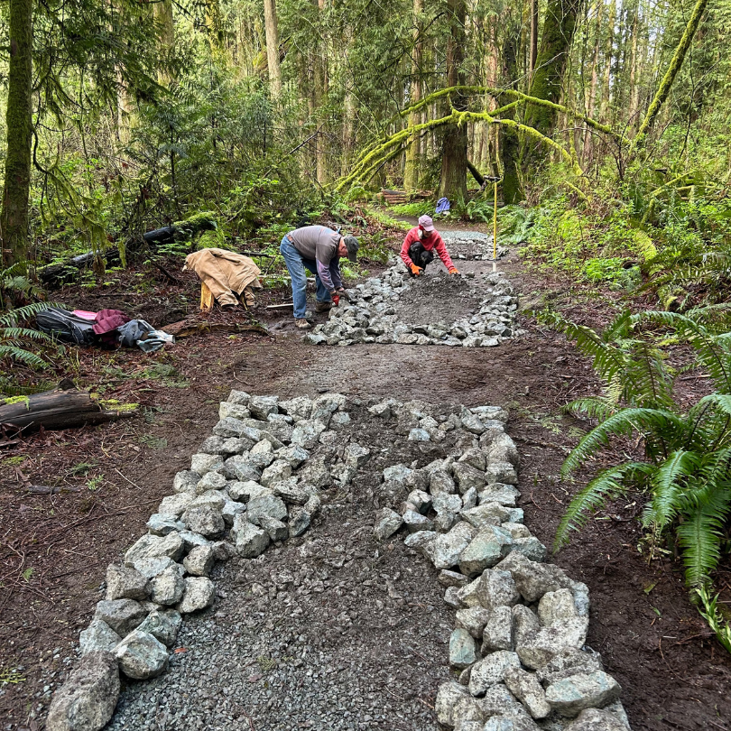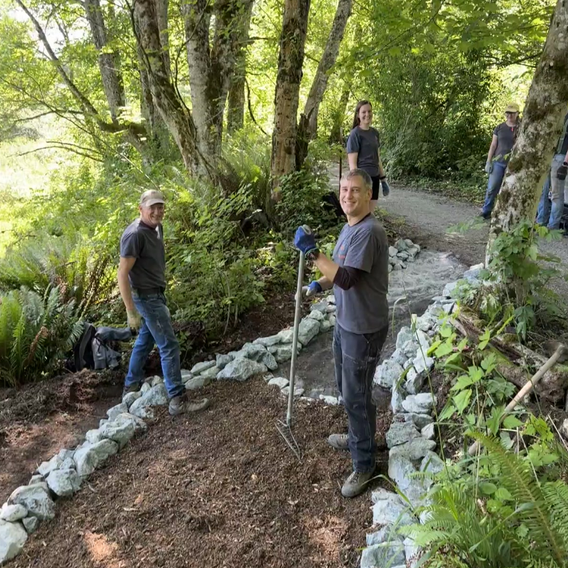 On the connector trail to Song Sparrow Bridge, our larger volunteer crews decommissioned the equipment access trail, transplanting over 50 ferns that had been uprooted during trail construction. They removed invasive holly and naturalized the area up to the trail’s edge, creating the appearance that this new trail has always been there.