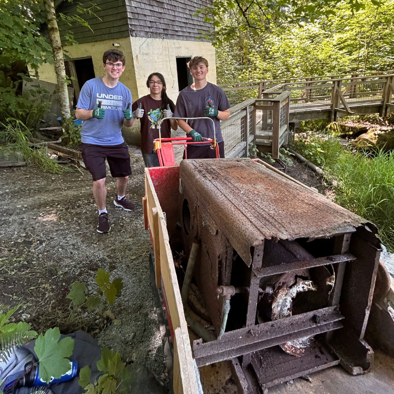 The temporary access trail was decommissioned and planted with ferns, as were the rock wall terraces. One of our Youth Leaders recruited her friends to help clean out the historic Pumphouse, removing years of refuse.