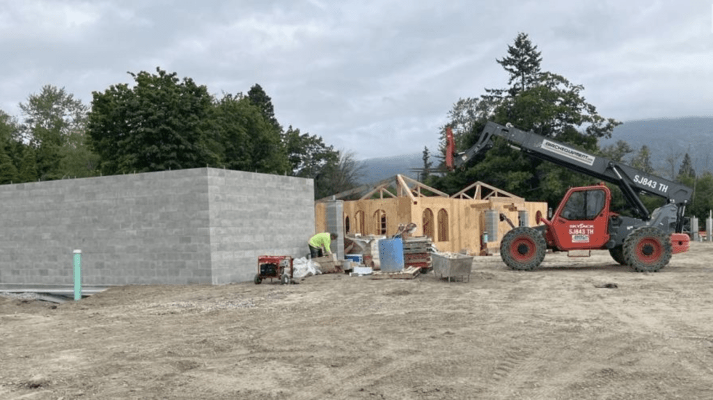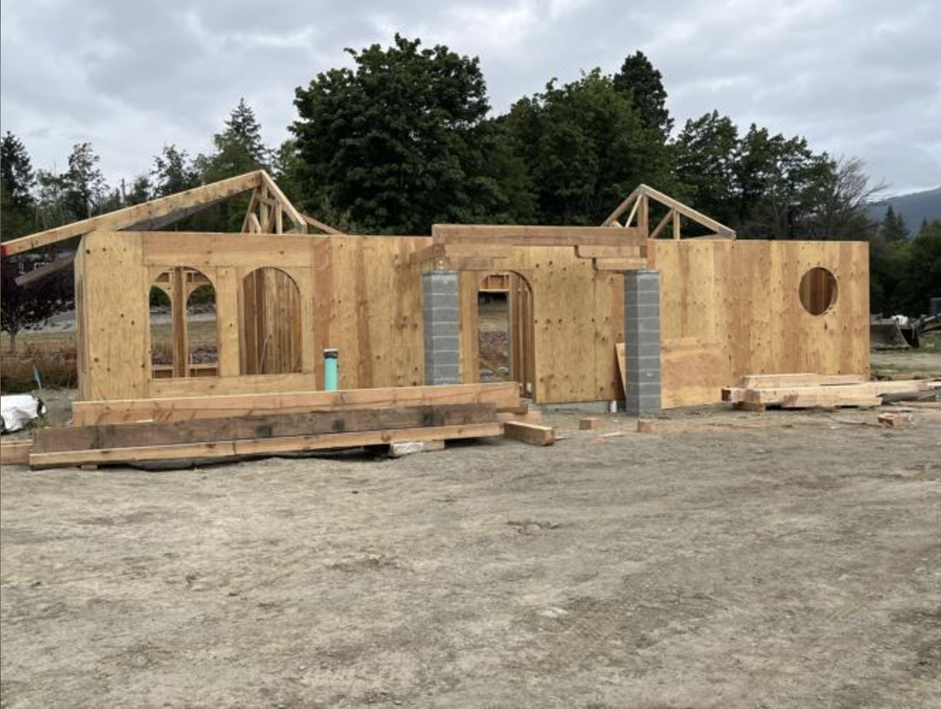 Currently, the caretaker’s house has been framed and awaits the installation of trusses.