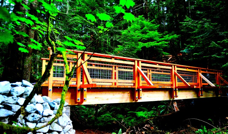 Building a Bridge (showing bridge assembly) The photos (here) were are at Little Mountain Park. We built this bridge too, the span and design is exactly the same as SW’s “Dovetail Bridge”… Moving a stringer in… No treated wood… Very well-secured… Positioning… Moved on a cable… Ready to go… Like Loading...