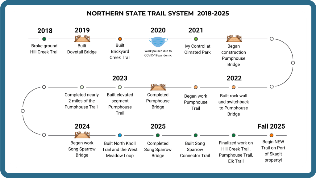 The trails at Northern State Recreation Area are the result of our partnership with Skagit County Parks and Recreation, the Port of Skagit, the City of Sedro-Woolley, and our incredible community of volunteers!